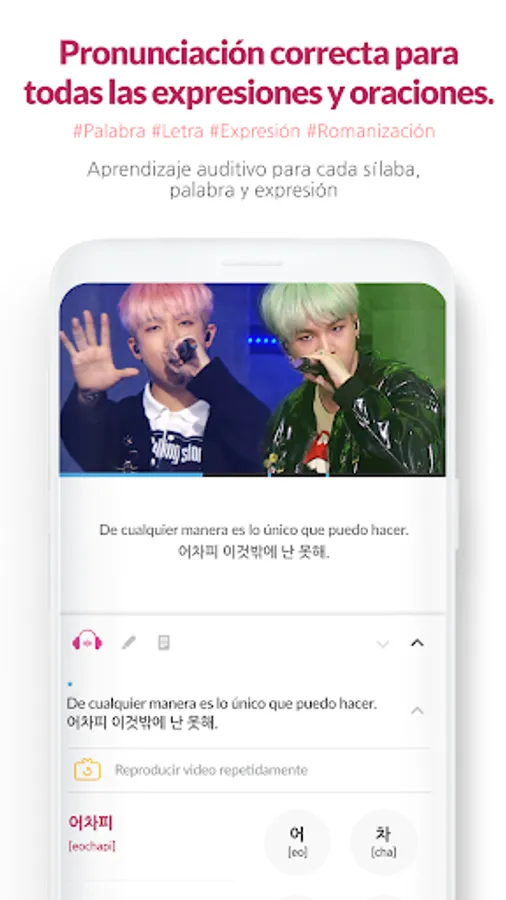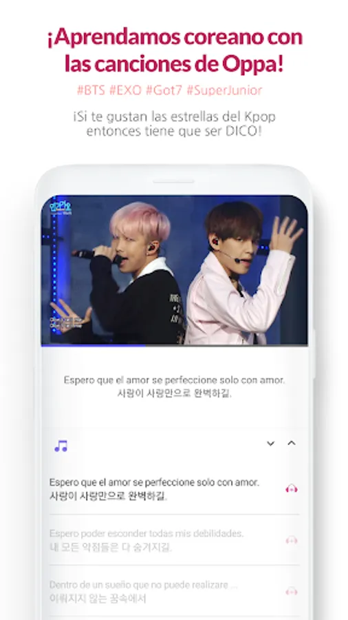 ● Learning with songs: practice the lyrics listening to the songs of your favorite KPOP artists, such as GOT7, EXO, SUPER JUNIOR, BTS, BLACKPINK, etc. with their respective meanings in Spanish and guide to pronounce as your favorite idol.