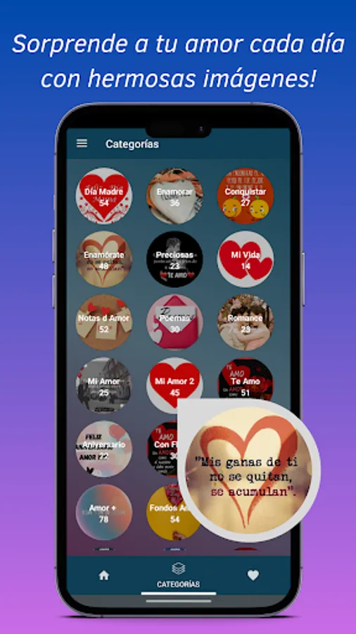 Our application has a wide variety of beautiful images of love with phrases for all tastes and situations. From love quotes or cute images, to passionate and romantic love words. You will also find love and romance tips that will help you strengthen your relationship and keep it always full of love and harmony.
