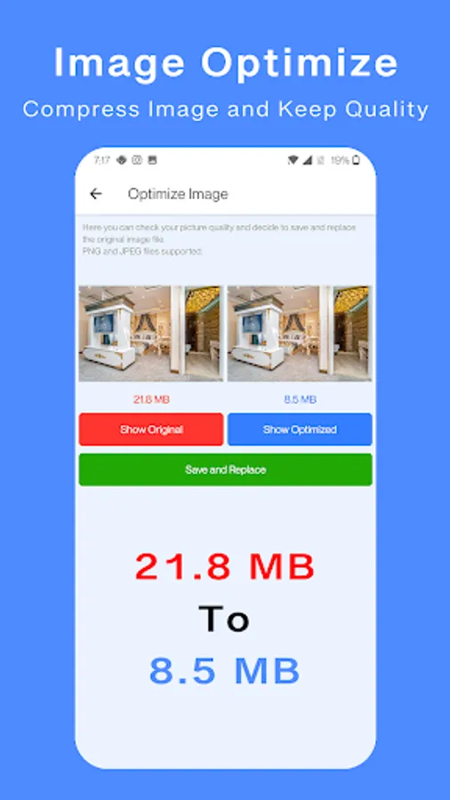 Image file with "21.8 MB" size after optimized update to "8.5 MB" and about "13.3 MB" free space made to my storage just with one file.
