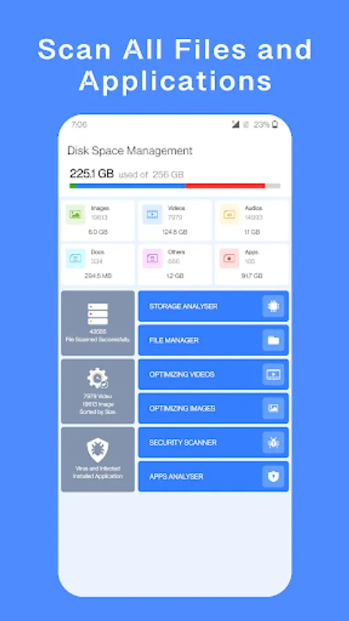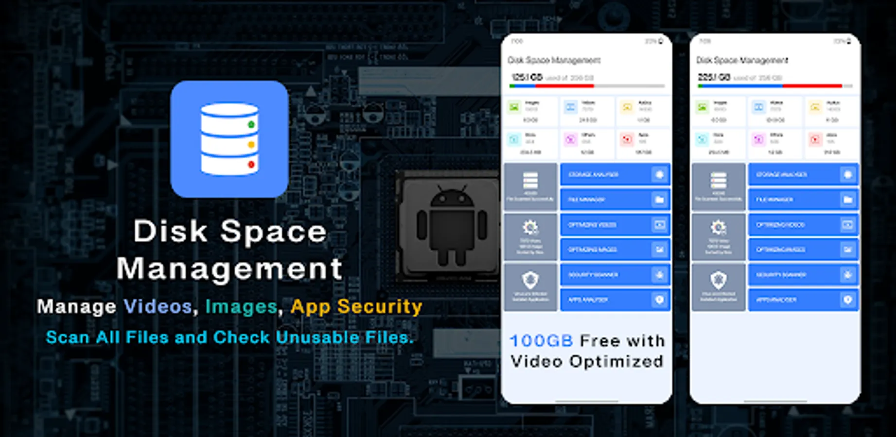 Clean storage to make free space with compress and optimize videos and images, you can delete unusable application and files sorted by size.