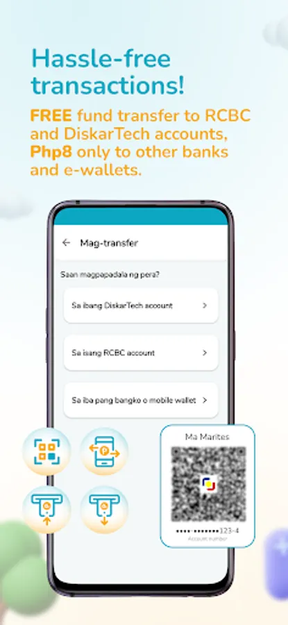 ● Transfer funds for as low as Php 8 (but free for DiskarTech to DiskarTech and RCBC to DiskarTech or vice versa transactions)