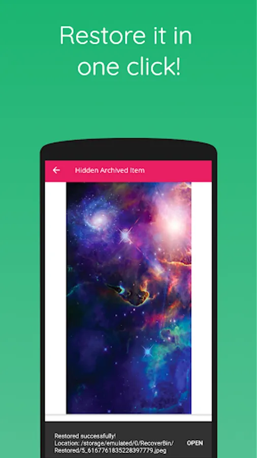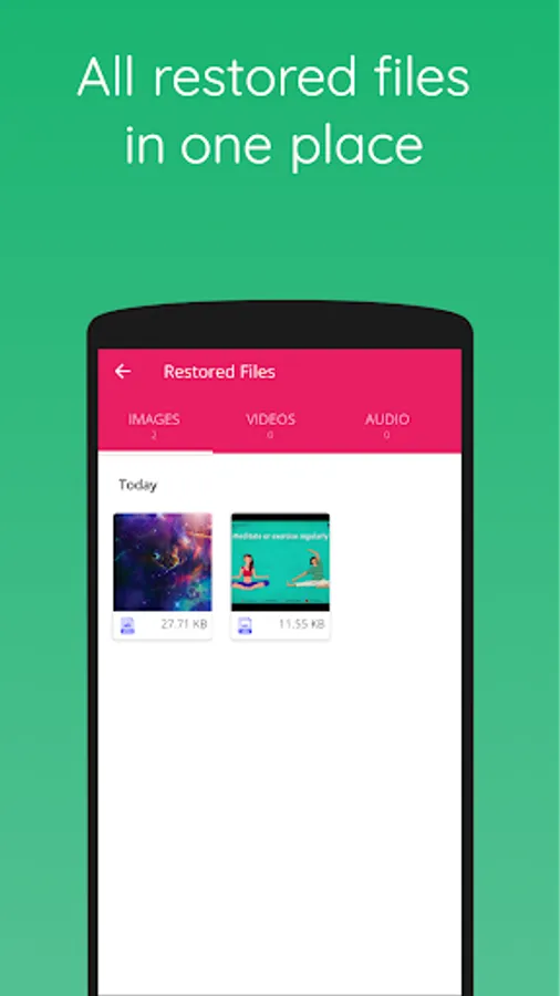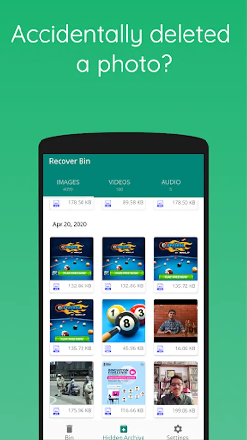 Not only it can act as a Recycle Bin, It can also deep scan your device to recover already lost photos, videos, PDFs and audio. Advanced hidden archive scanner can reveal and undelete most of the lost files and restore them with original quality.