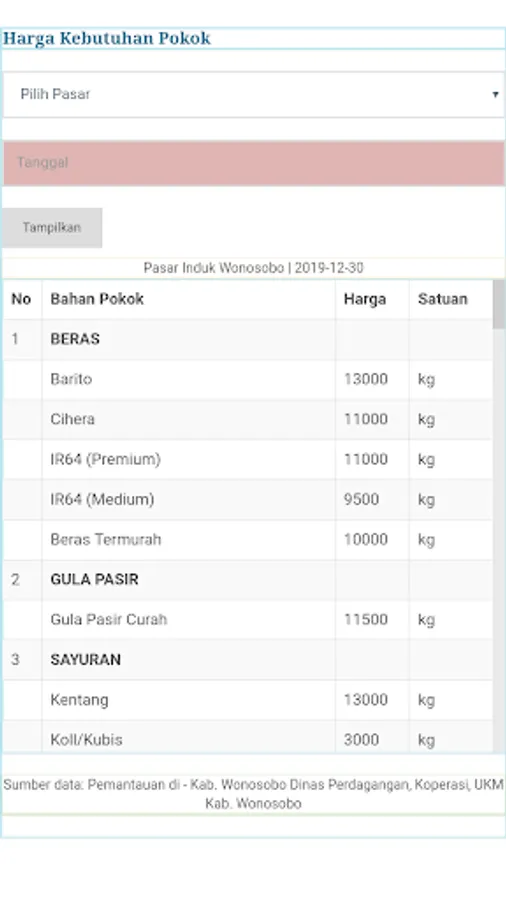Application that displays a list of basic needs for the people of Wonosobo Regency. Data updated every day. Data sources from the Department of Trade, Cooperatives, UKM District. Wonosobo.