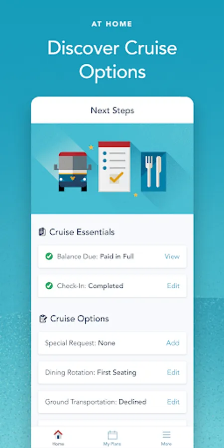 When you’re at home and preparing to sail: Plan your ideal vacation, make payments, use My Online Check-In, explore and book activities, add our Protection Plan, ground transportation, change dining Seating and make special requests regarding dietary needs, accommodations for little ones, celebrations and more.