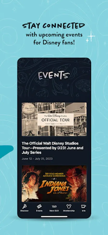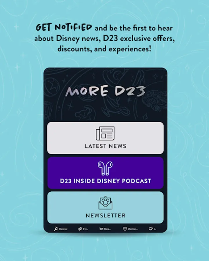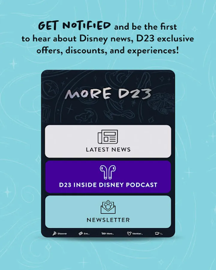 • Turn on Notifications to get ticket on-sale alerts for D23 events and be the first to hear breaking news around The Walt Disney Company, member-exclusive offers and discounts, and special experiences for D23 Members throughout the year.