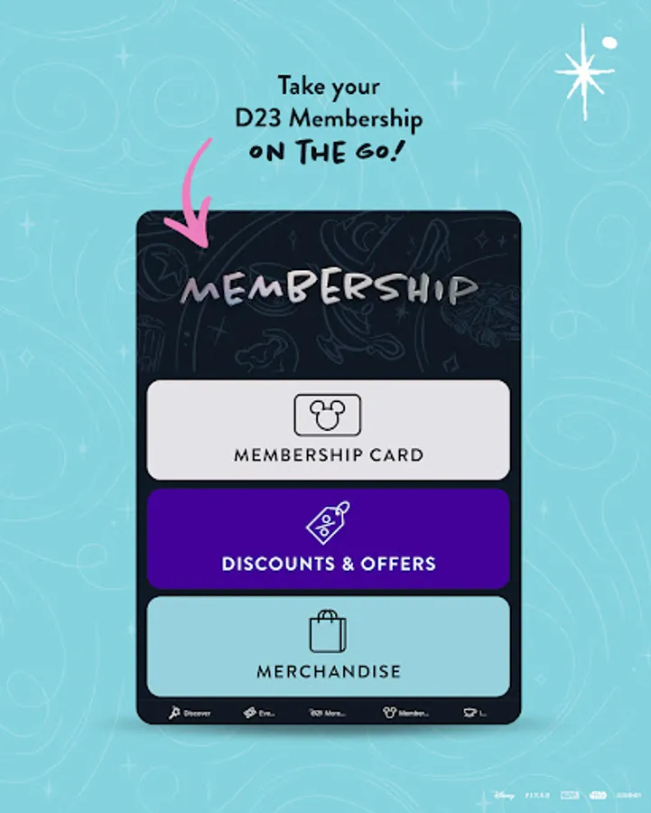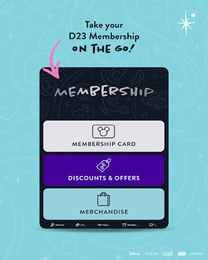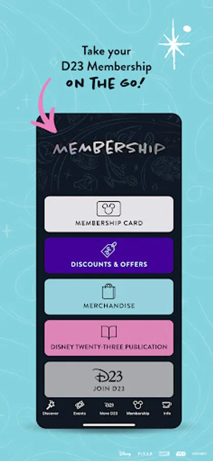 • Access your DIGITAL D23 MEMBERSHIP CARD to redeem eligible member benefits anytime, anywhere (D23 Membership required; learn more at D23.com/join)