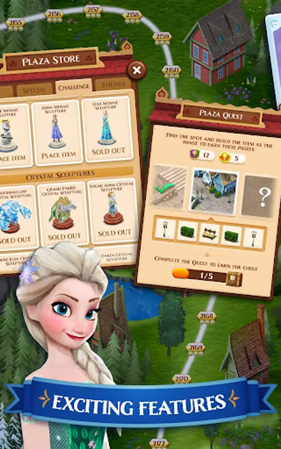 BRING YOUR OWN ARENDELLE TO LIFE - Earn coins & rewards by completing puzzles to decorate and customize your own Plaza in Arendelle with shops, fountains, carts, and more!