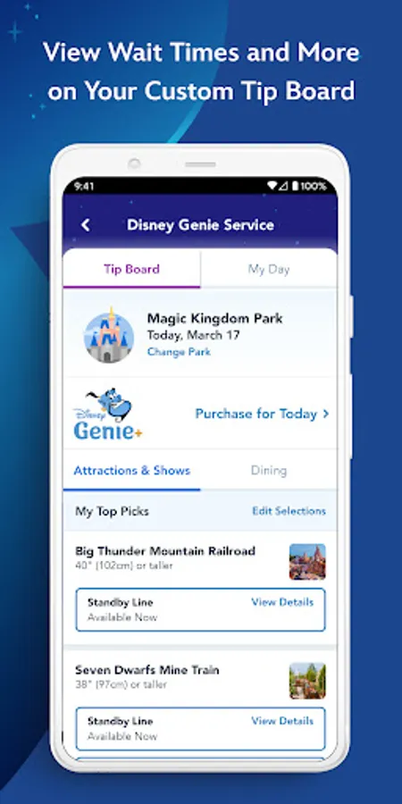 -Quickly access real-time wait times, park hours, Character Greetings, showtimes & more.