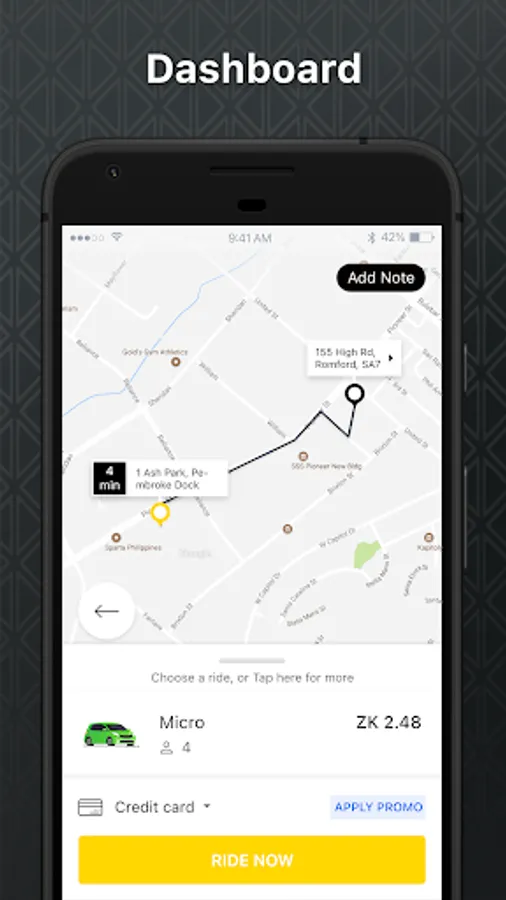 Requesting a ride: After selecting the ride type, the user can then request a ride by tapping the "Request Ride" button. The app will then connect the user with the nearest available driver.