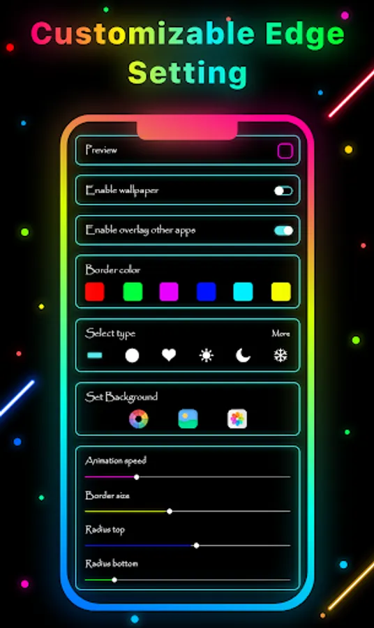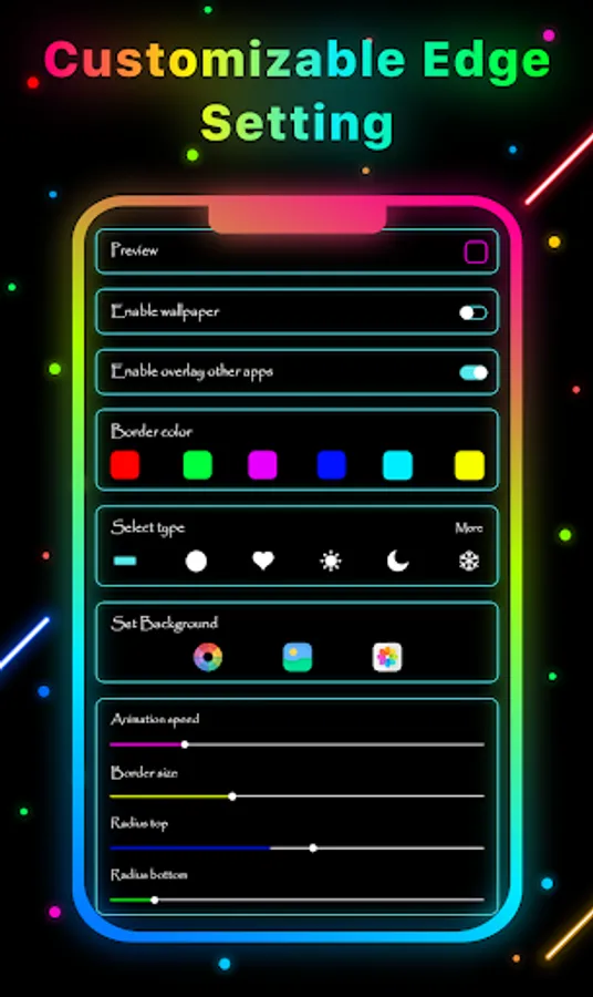 Edge Lighting screen wallpaper is perfect for staying connected when facing your phone. It adds a stylish border to your lock screen & home screen wallpaper. Whether you prefer a delicate and elegant glow or a bold & vibrant burst of colors, the RGB edge lighting feature lets you personalize your phone screen borders.