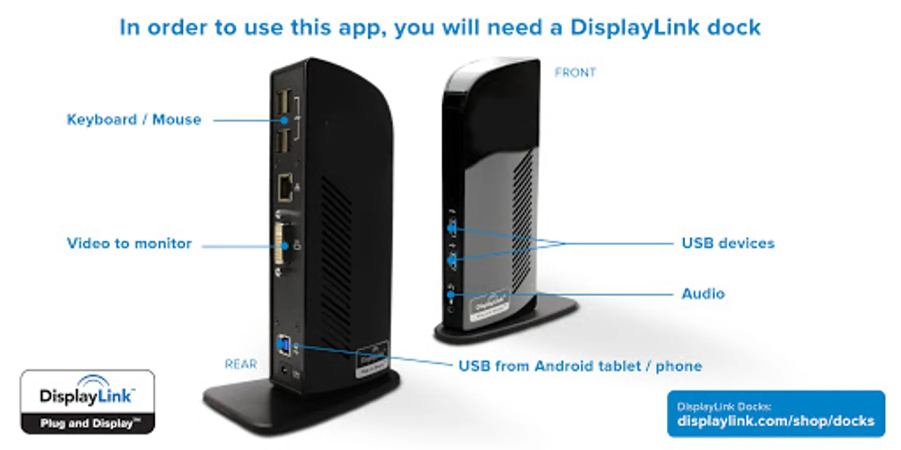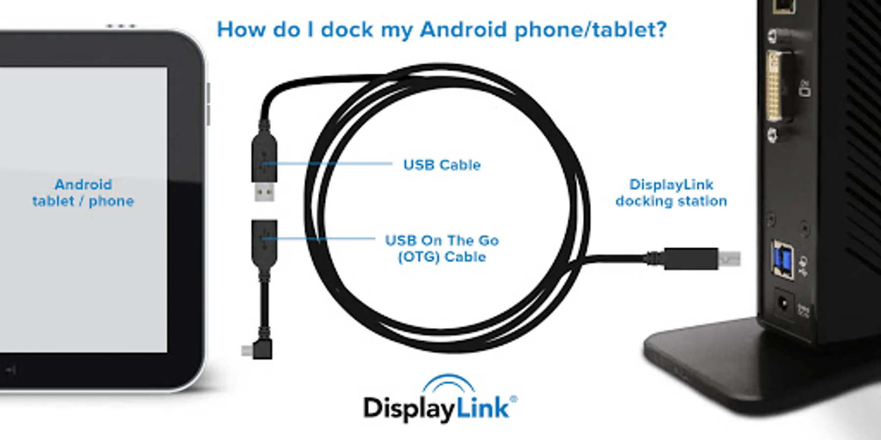 If used with a DisplayLink enabled docking station, larger monitors, keyboard and mouse can be connected to the Android device making it easier to interact with productivity apps.