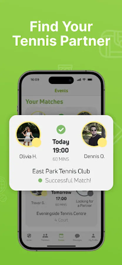 Kort makes it easy to find other players in your area. Simply create your profile, enter your experience level and location, and we'll show you the most suitable tennis players nearby. You can connect with them directly through our super-fast messaging interface, and even set up open invitations for others to join your match at a specific location and time.