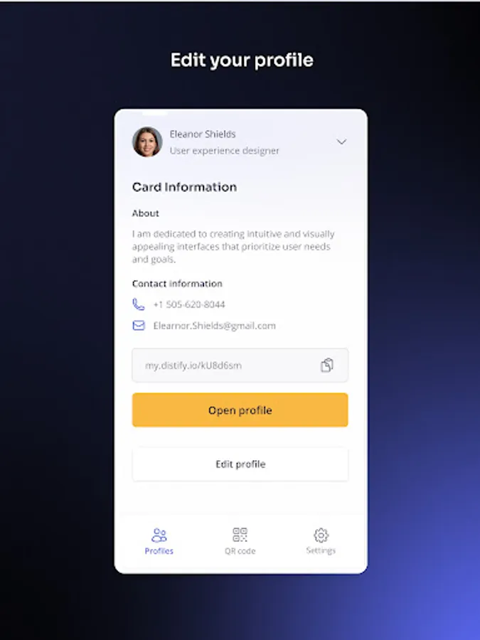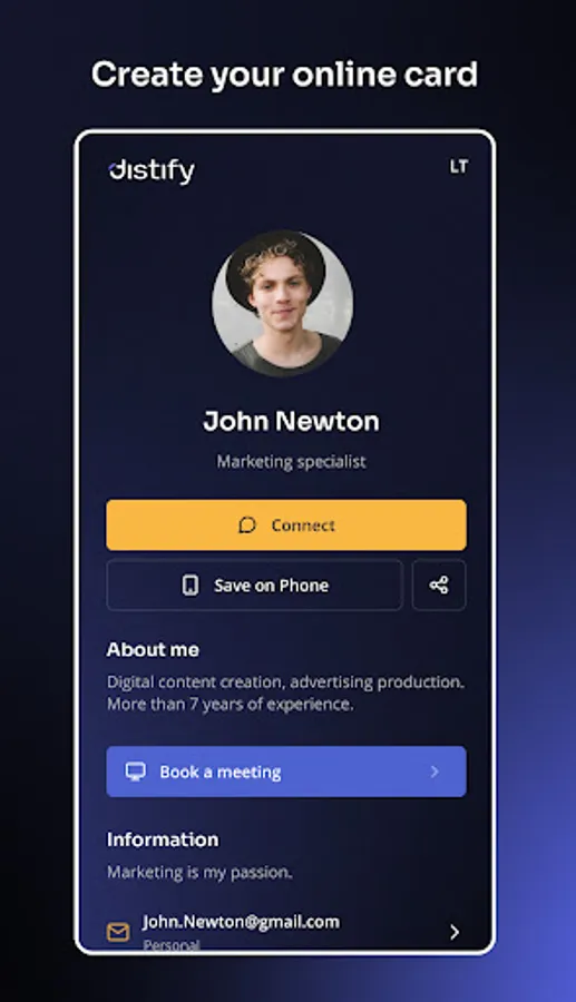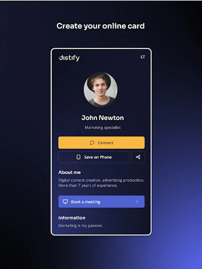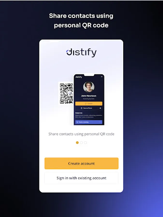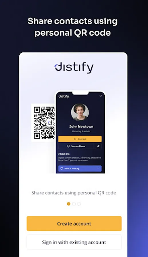 Distify is a cutting-edge app that enables users to create personalized smart business cards and share them effortlessly via QR codes. With a focus on eco-friendly networking, Distify streamlines professional connections while offering customization and secure data sharing. Transform your networking experience today!