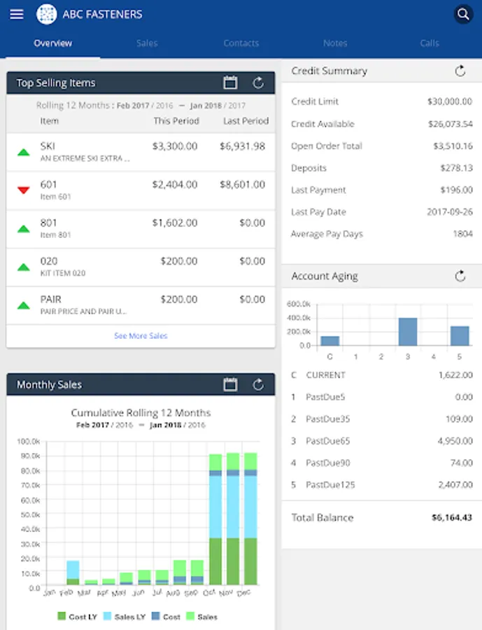 The interactive map displays nearby customer locations allowing the sales person to accurately plan his/her travel itinerary. Distribution One Mobile CRM also presents quick form data on topics like item trends and accounts aging. One-touch access displays all items a customer has bought as well as graphical monthly sales charts identical to those utilized within ERP-ONE+. These graphs can be customized to rolling 12 months, cumulative, and calendar year views.