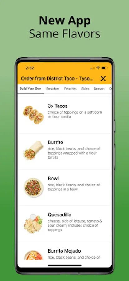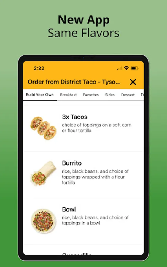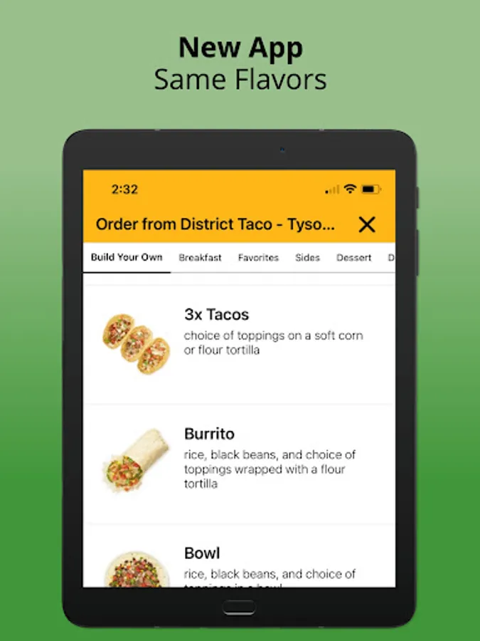 Welcome to the District Taco app. Find a restaurant near you and order ahead for pickup, curbside, and delivery. District Taco Rewards members can receive points with qualifying purchases, redeem available rewards of your choice and reach new tiers with increasing benefits.