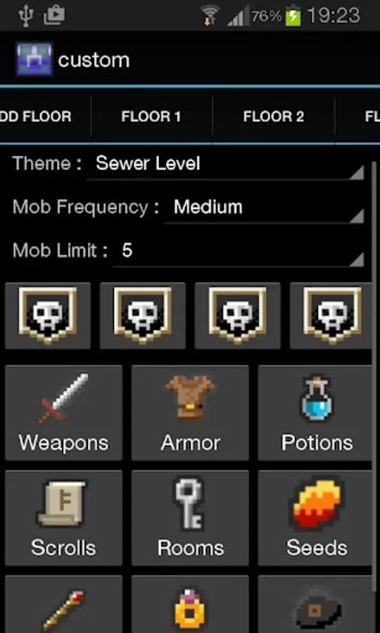 Your Pixel Dungeon is a modification of the open source game Pixel Dungeon, which is a popular roguelike for the android platform. This mod currently adds a tutorial and a map editor feature. Maps can be exported to/imported from a public folder called YourPD. When connected to a computer you can copy the files in the folder to send to other people, and put other peoples' maps on your own phone (if you have downloaded any and placed on your phone).