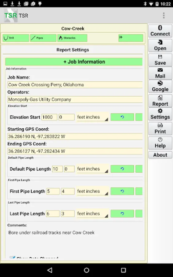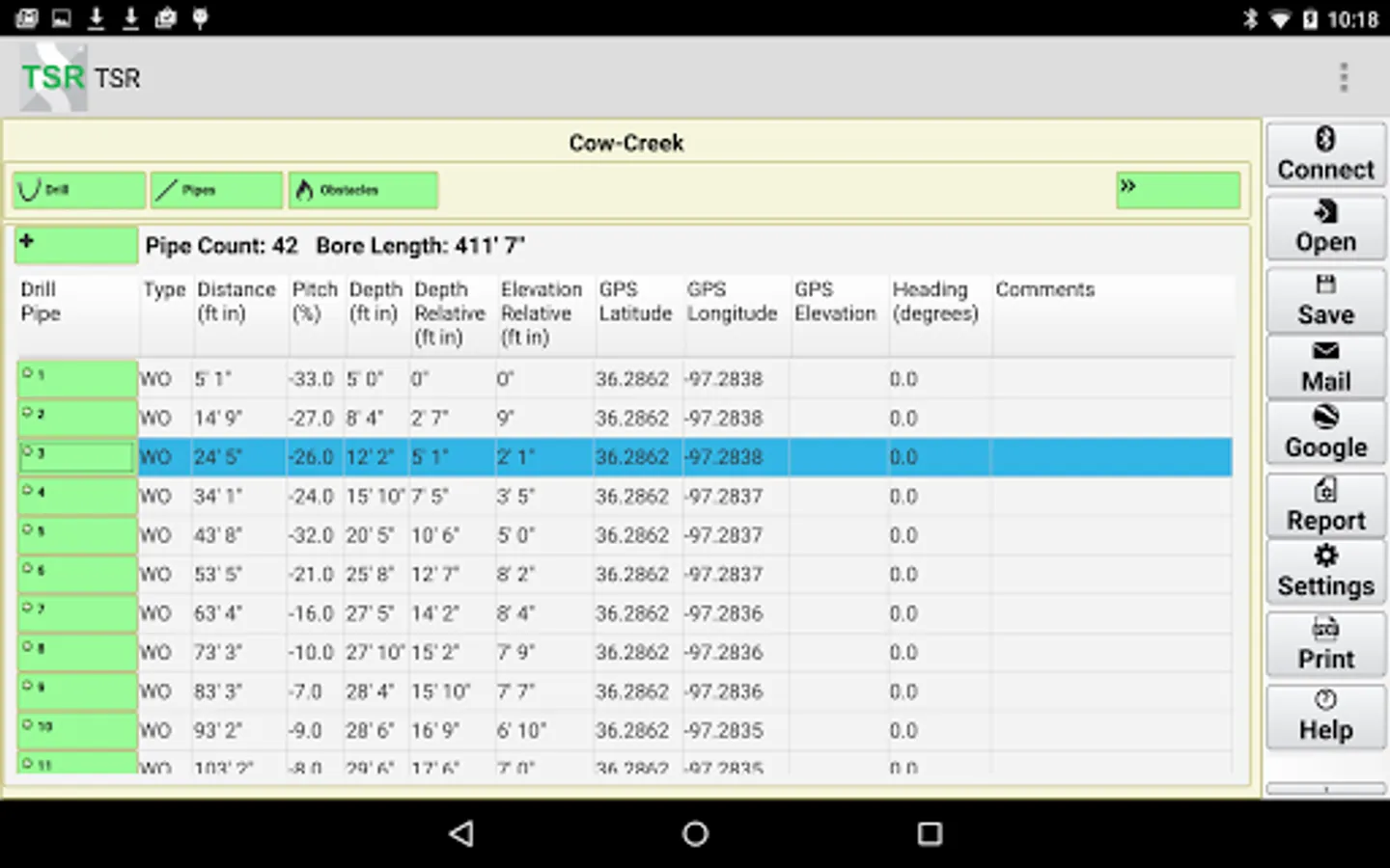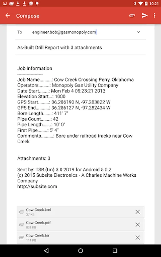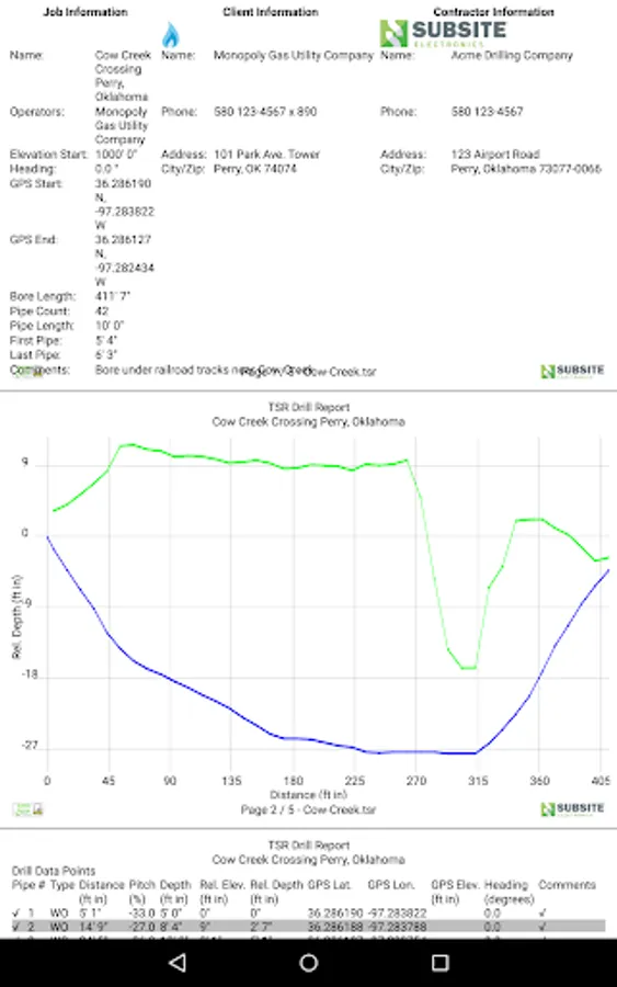 The Subsite Electronics TK Series HDD Guidance System logs your drill pipe location data including depth, pitch, and GPS coordinates. The Subsite TSR Mobile app makes it easy to create an As-Built report with a single push of the button. View your bore path in satellite imagery apps or email a PDF report back to your home office for review by your project engineer. Send a copy to your customer to print and view the As-Built PDF report. Open the KML file email attachment using satellite imagery applications to view the job site location from GPS data logged by the TK Series HDD Guidance System.