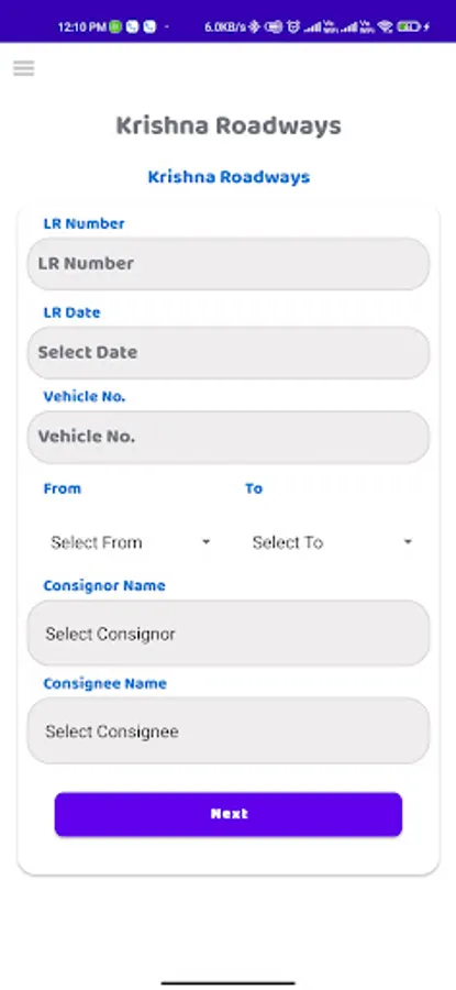 This app allows user to add LR Entry which comprises of No., Date, Vno, Consignor and more.
