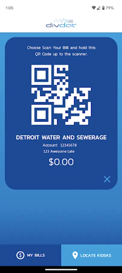 - User-specific scannable QR Code for use in conjunction with the DivDat Bill Payment Kiosks for quick and easy account look-ups