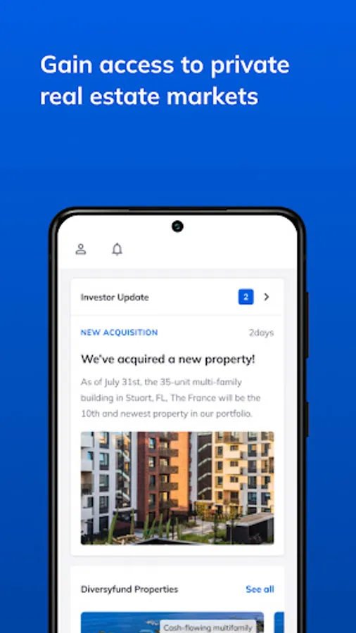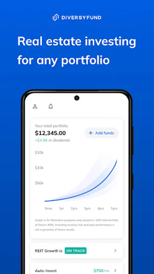 + DIVERSIFY AWAY - We make it easy to diversify away from stocks and bonds and into real estate - with historically higher returns and less market volatility. With DiversyFund, we make balancing your portfolio as simple as a tap on your screen..