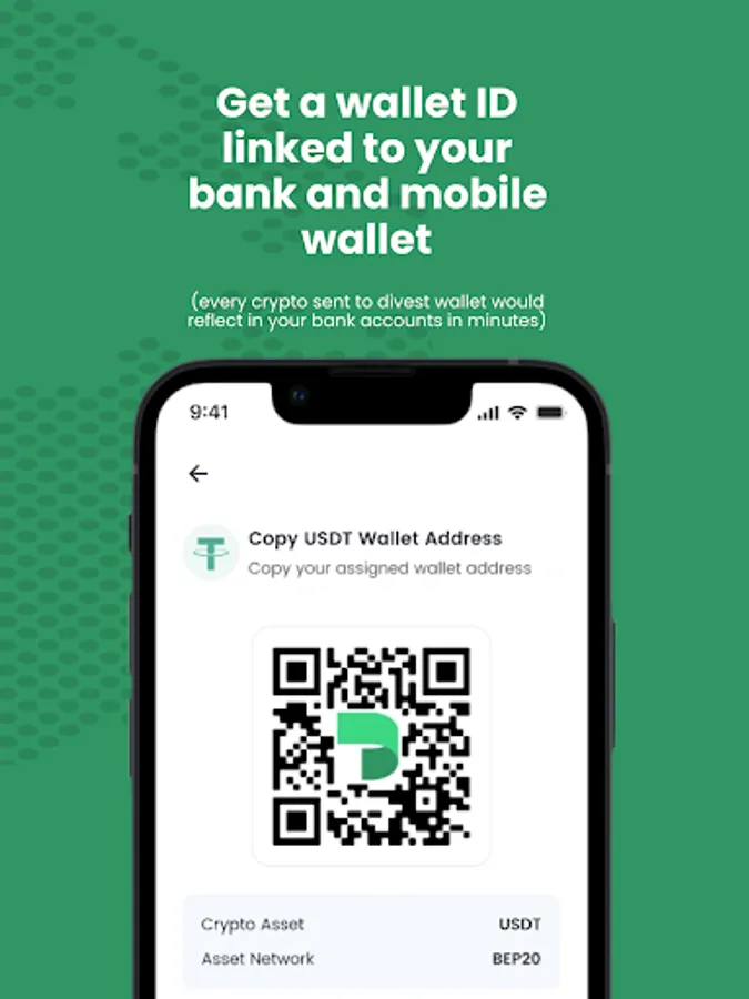 With Divest, you get a unique wallet address that allows you to send your crypto assets and convert them into cash in an instant.