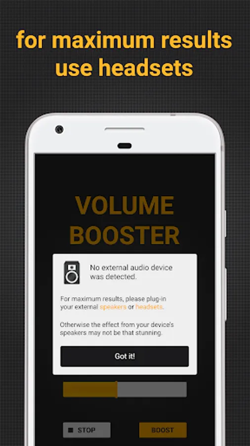 Using your built-in Android eQualizer, Volume Booster Pro adjusts the frequencies of your device and simply makes it louder.