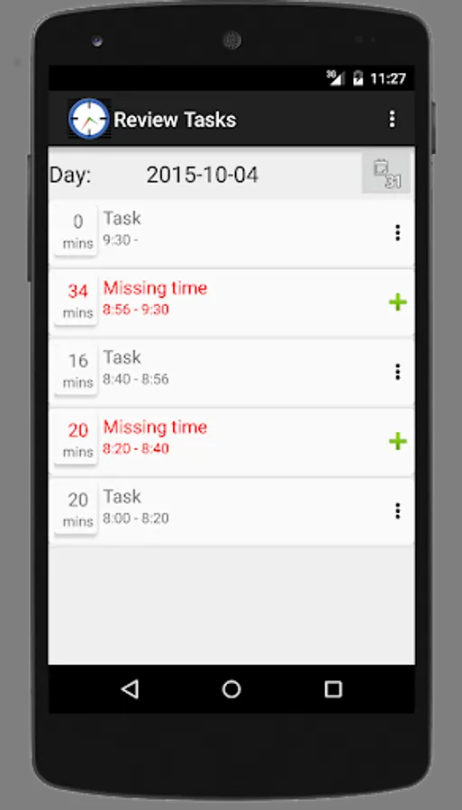 A notification will show you how much time you spent on the current task. You can also easily review tasks for the current day (or past days), locate "missing" time and create tasks from it. You can also mark tasks as "idle" time (lunch for example) to ensure that all time is accounted for.