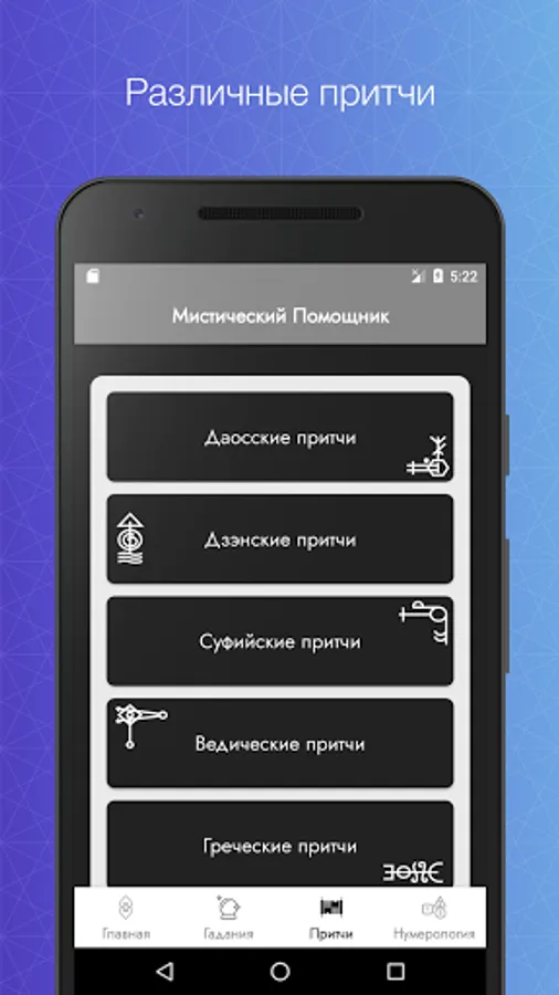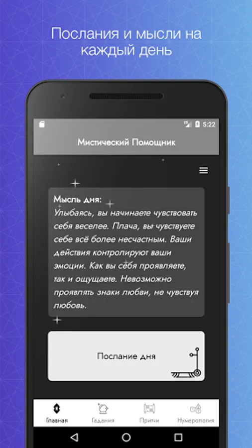In the application you will find a variety of fortune-telling: hints-thoughts for every day, predictions for every day, wise parables for every taste, with which you can stick for a long time.