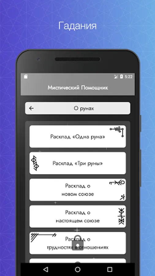 Description of runes, layouts of runes, interpretation of layouts for runes. You do not need to study the runes to guess by them, all the descriptions are already in our application for each rune and all the meanings, both direct and inverted for each layout. Guess one rune, three, or make layouts for money, love, etc. in just a couple of clicks.