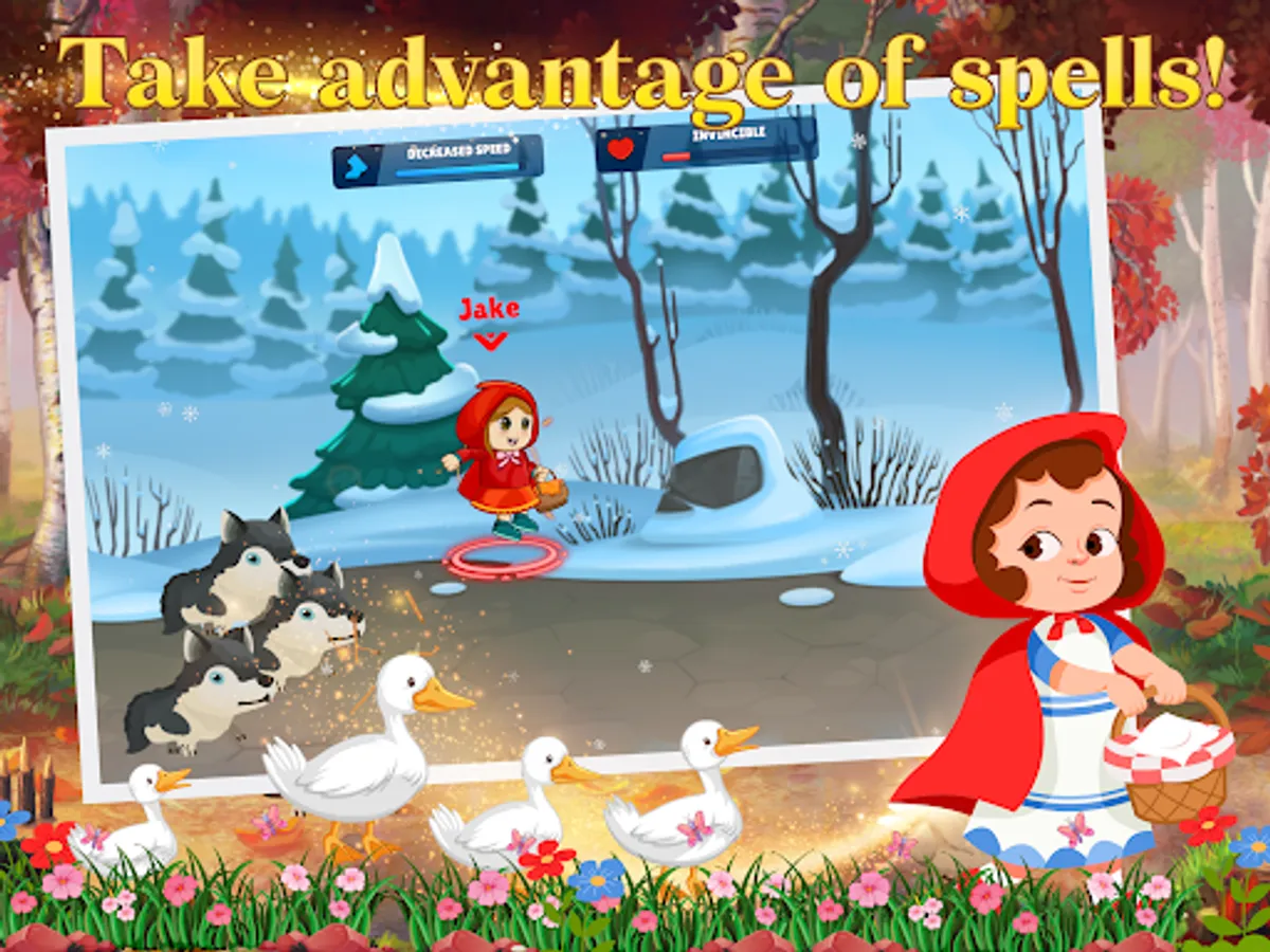 With your favorite childhood characters, explore the magical realm of fairy tales. An infinite runner, complete with realistic sounds and high-quality graphics. Touch on the screen to jump, avoid obstacles and collect stars!