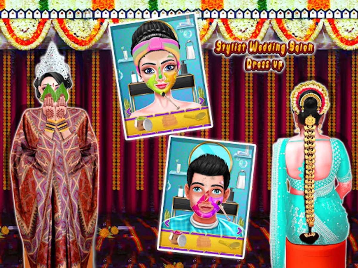 Indian Wedding Salon is a Makeup, dress-up and spa with hair salon. Wedding planner is select perfect dress for the Indian bride and her BFF. The traditional makeup is a very important part, so make the bride up as pretty Bollywood Royal Celebrity. In dress-up section on bride and groom get luxurious collection of Indian designer choli, sarees fashion game for wedding. Enjoy our royal couple Indian wedding game. Some south indian wedding are same as gujarati wedding, western indian wedding , punjabi wedding, hijab wedding, Indian celebs wedding such as Virushka Ki Shaadi.