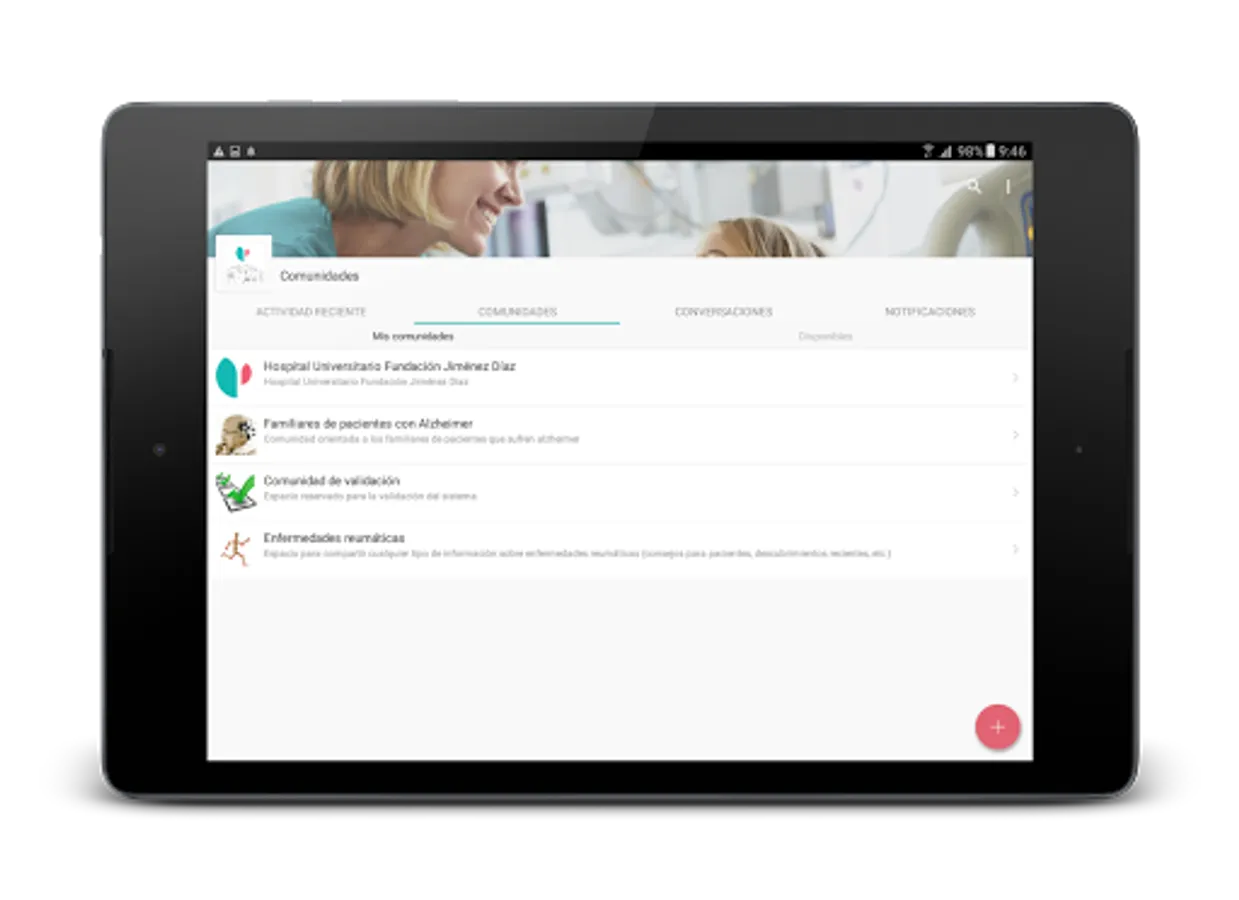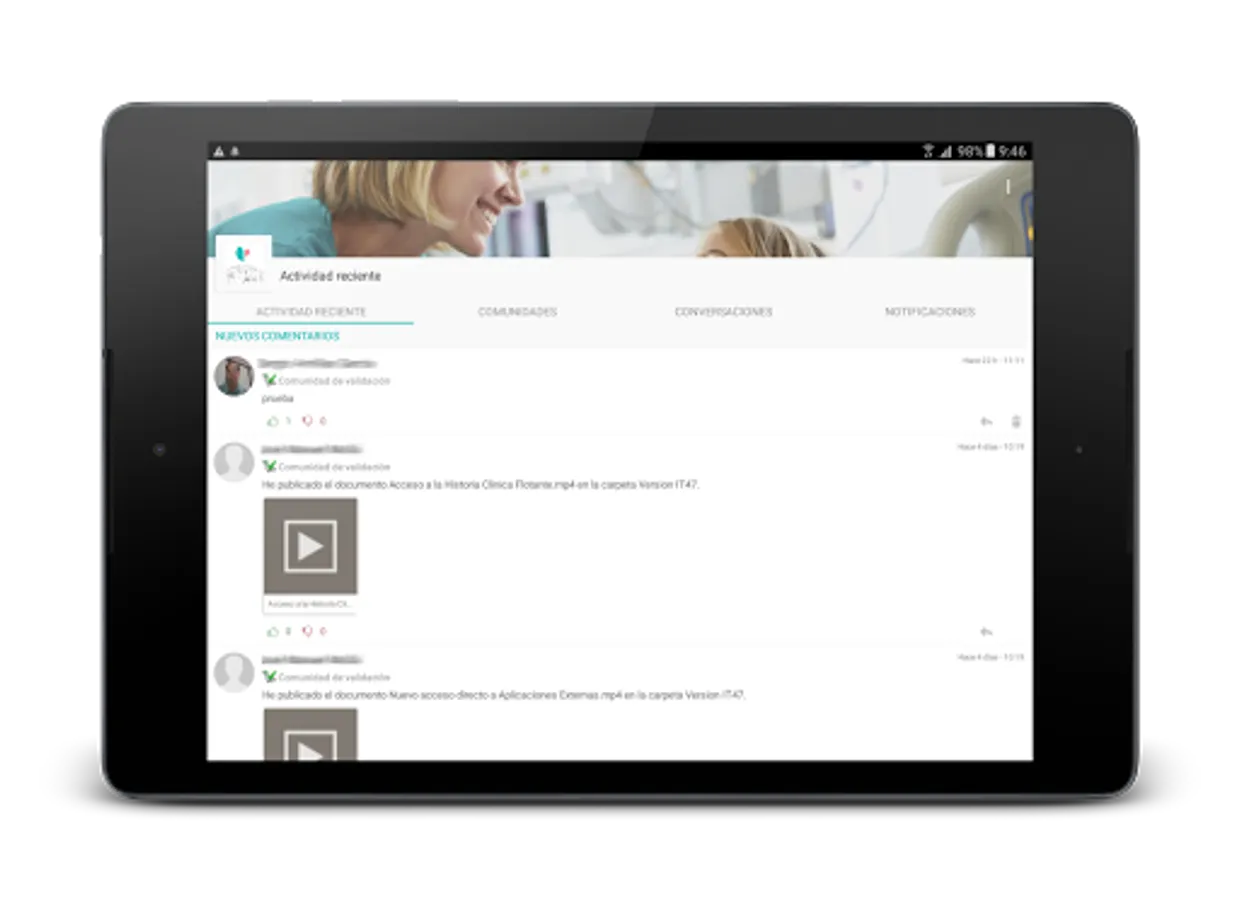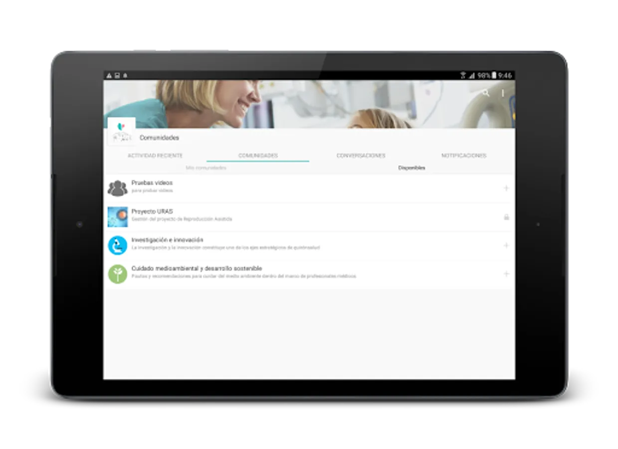 Application for professionals, to enable access to the collaboration platform Quirónsalud. This platform allows the creation of spaces where users can participate openly and leave opinions, discuss with other users and upload videos, images or documents that support the exchange of information within the different communities.