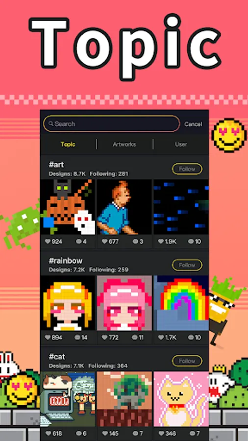 *Over 700 thousands pixel art designs and 1 million users community. Communicate and interact with fellow community members.