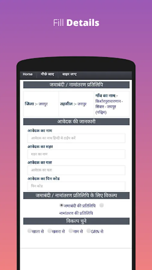 How to Check Your Account - Just fill applicant information like name address city and pin code also you can check your land records on this app by searching these using khasra number or account number or your name. You download and print these records for your reference and to view your account.