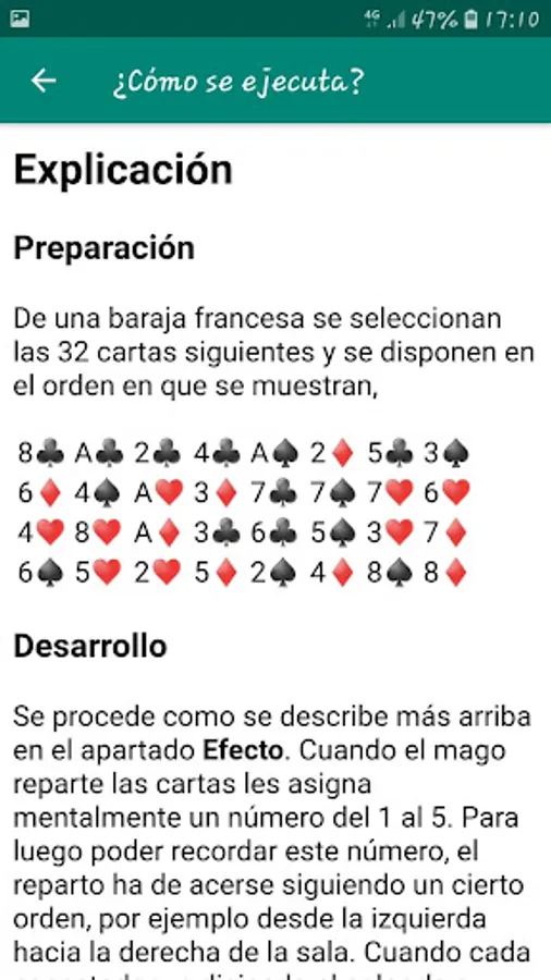 With this application and a French deck it is possible to perform a surprising magic trick. The trick was originally popularized by Persi Diaconis and Ron Graham in their book Magical Mathematics. The version presented here facilitates its execution since it does not require memorizing anything. It is the application that takes care of the hard work.