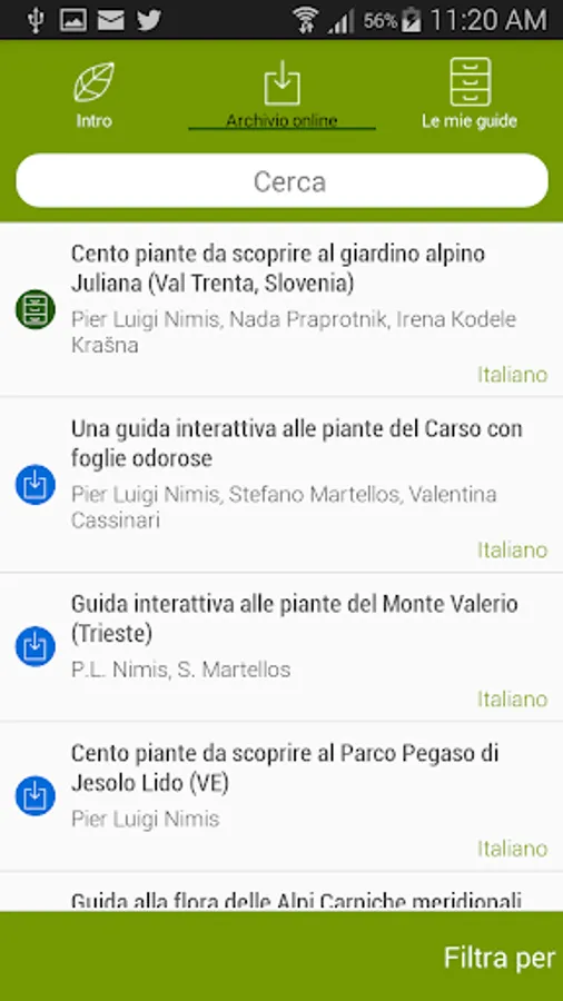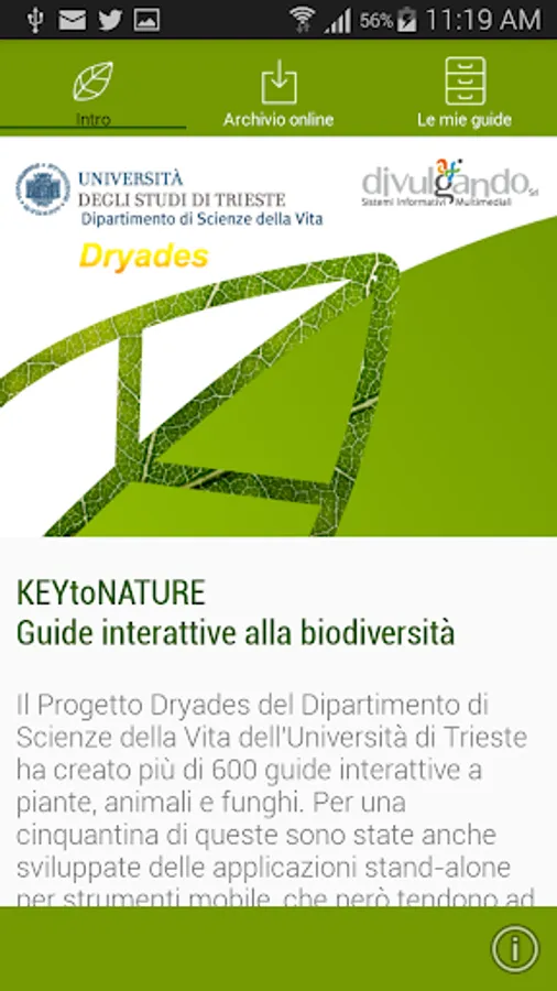The Dryades Project of the Department of Life Sciences of the University of Trieste has created more than 600 interactive guides to plants, animals and fungi. For fifty of these were also developed the stand-alone applications for mobile tools, but tend to have a rather ephemeral life, why they do not always work after the operating system updates. That is why we created 'KeytoNature', a player that allows you to download on a mobile device any guidance produced by Project Dryades, transforming it into a standalone application. The user only needs to connect to the network, choose one of the guides available from the archive (possibly using the filter 'language' or keyword), and download it onto your instrument, then the app will work without an internet connection. The download time depends also on the number of species included in a guide and tends to decrease with the number of downloaded guides. The download of the first guide may take several minutes.