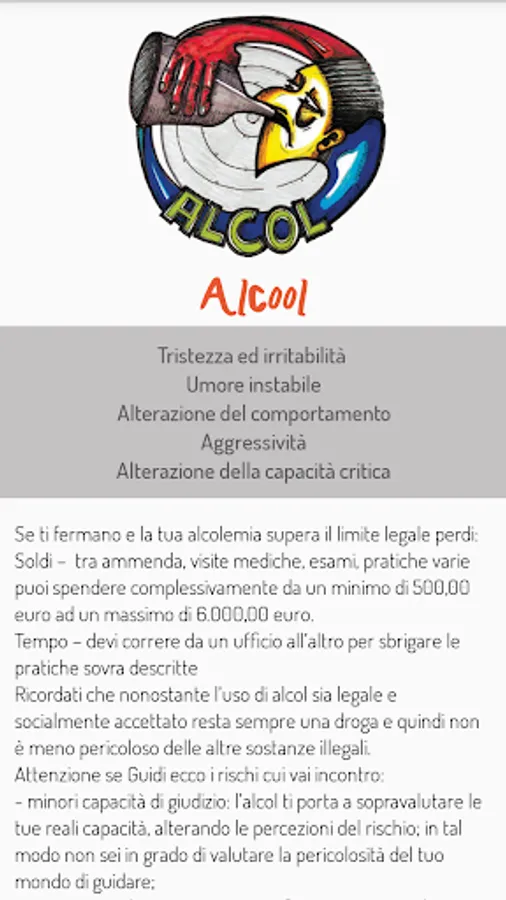 The purpose of this app is to provide correct information on the effects and risks related to substance use and alcohol, to promote awareness and self-protective attitude.