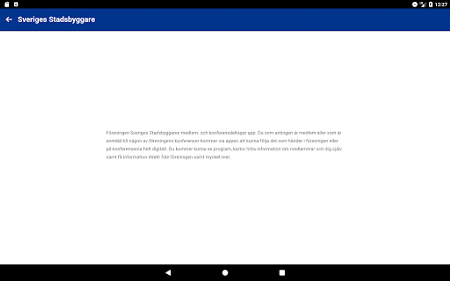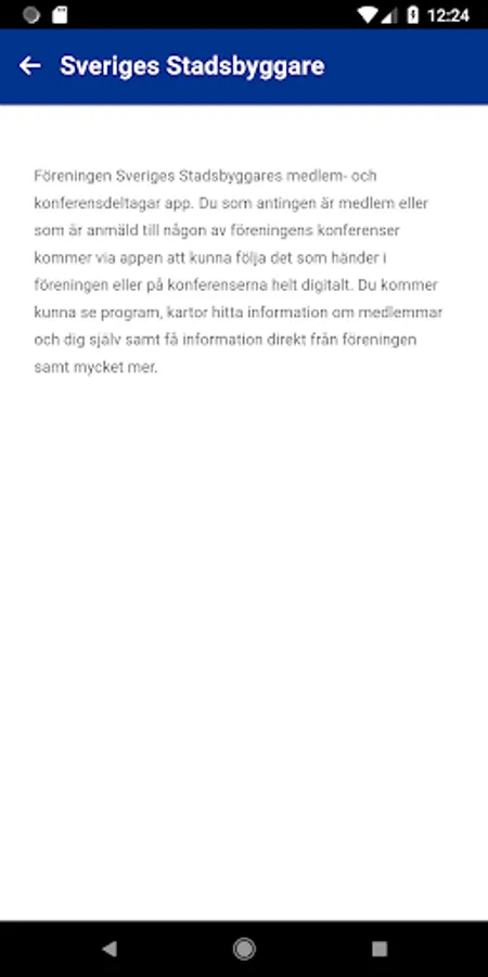 Föreningen Sveriges Stadsbyggares medlem- och konferensdeltagar app. Du som antingen är medlem eller som är anmäld till någon av föreningens konferenser kommer via appen att kunna följa det som händer i föreningen eller på konferenserna helt digitalt. Du kommer kunna se program, kartor hitta information om medlemmar och dig själv samt få information direkt från föreningen samt mycket mer.