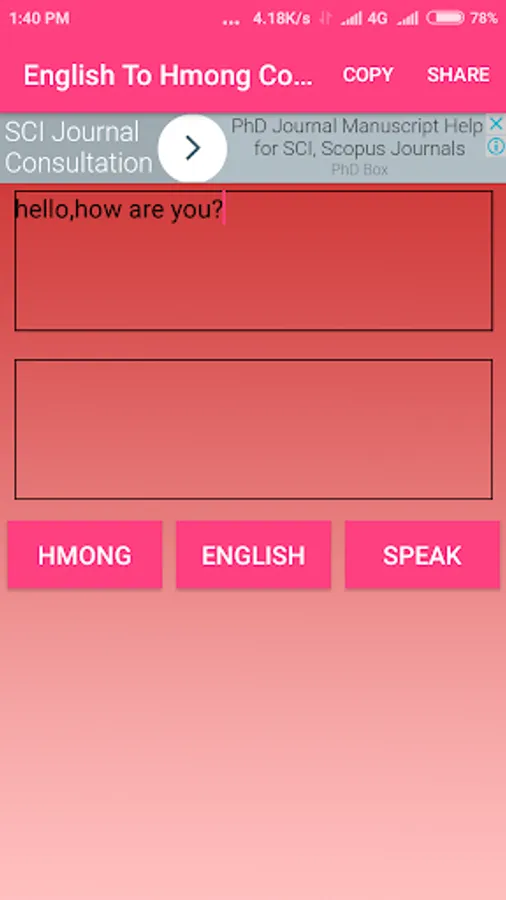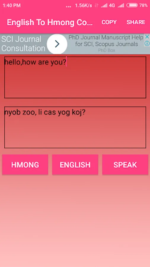 You can learn Hmong language by taking free education app course of English to Hmong translation and Hmong to English translation. Learning English using Hmong or Hmong using English has never been easier! Let this app be your best friend as a Hmong translation teacher for easy & fast native speaker translations with Hmong translate educational app, which can be used like a language learner dictionary. If you are a student, tourist or traveler, this talking translator training teacher will teach you to learn languages fluently! Learn & Master the pronunciation as HmongEnglish Translator has in built pro voice text translator feature. Use our free text translator for English Hmong translation to & from English. Hear the translated text with talking Hmong app English translation feature & conveniently communicate with your friends, girlfriends, boyfriends, family members or tourists with accurate pronunciation. Simply type or paste Hmong or English text & tap to learn the phonetic Hmong language for free. For Students – you can now complete your language homework & assignments easily with Hmong English translator.