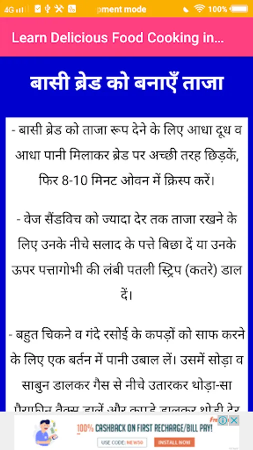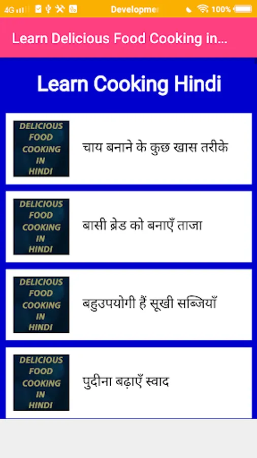This app gives you each Recipes in Hindi only. It is a very useful App for cooking lovers as well as new cooking Learner also.This app will use in your kitchen at any time.