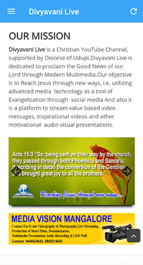 Divyavani Live is a Christian YouTube Channel, Divyavani Live is dedicated to proclaim the Good News of our Lord through Modern Multimedia.Our objective is to Reach Jesus through new ways, i.e. utilizing advanced media technology as a tool of Evangelization through social media And also it is a platform to stream value based video messages, inspirational videos and other motivational audio visual presentations.