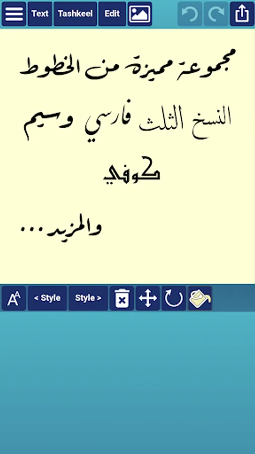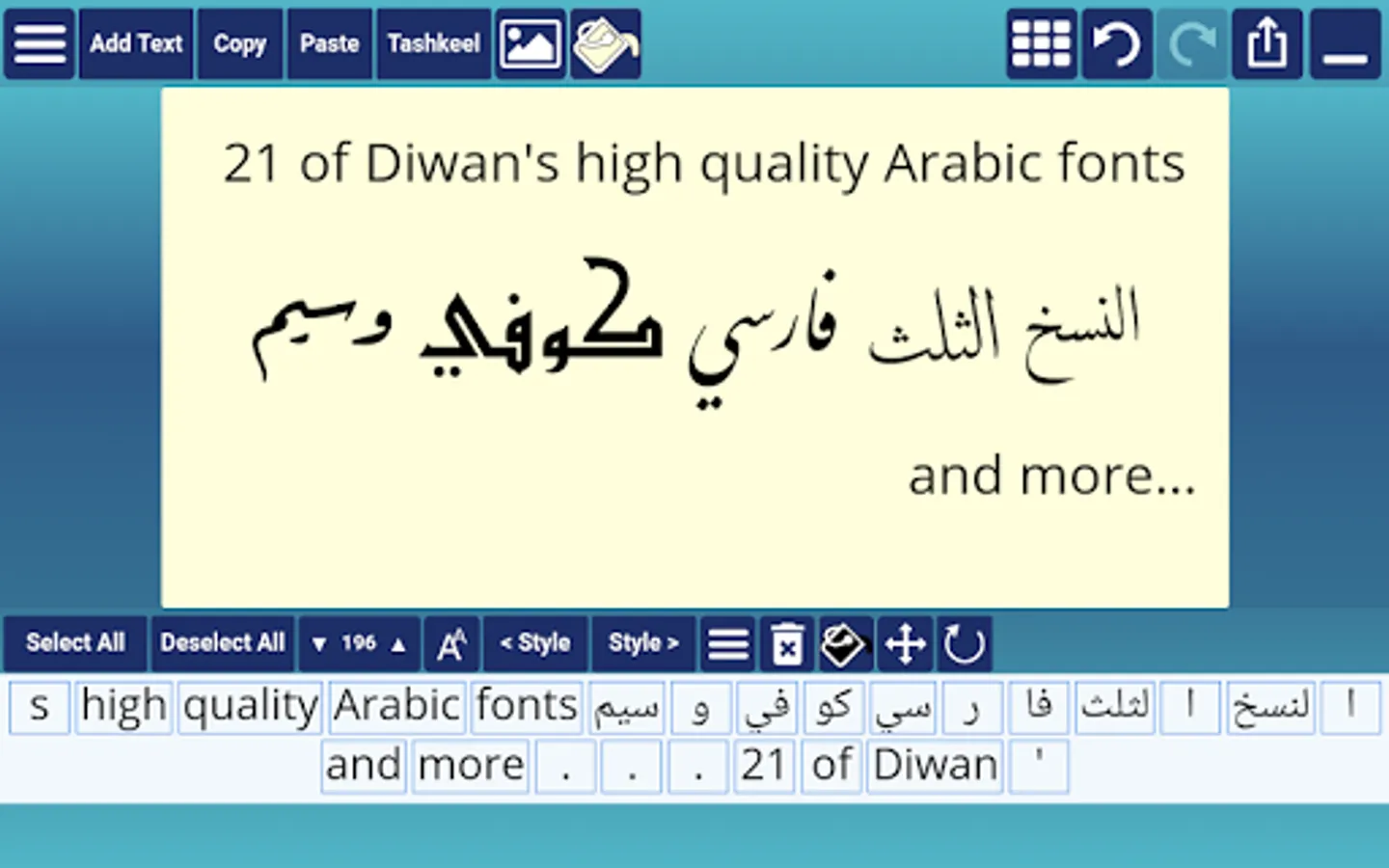- Choose from a collection of 21 fonts including Diwan's most advanced Arabic fonts, like Diwan Naskh Mishafi, Diwan Thuluth, Diwan Farsi, Waseem (Ruqa’a like font), Kufi, and more.