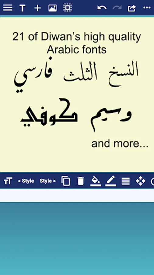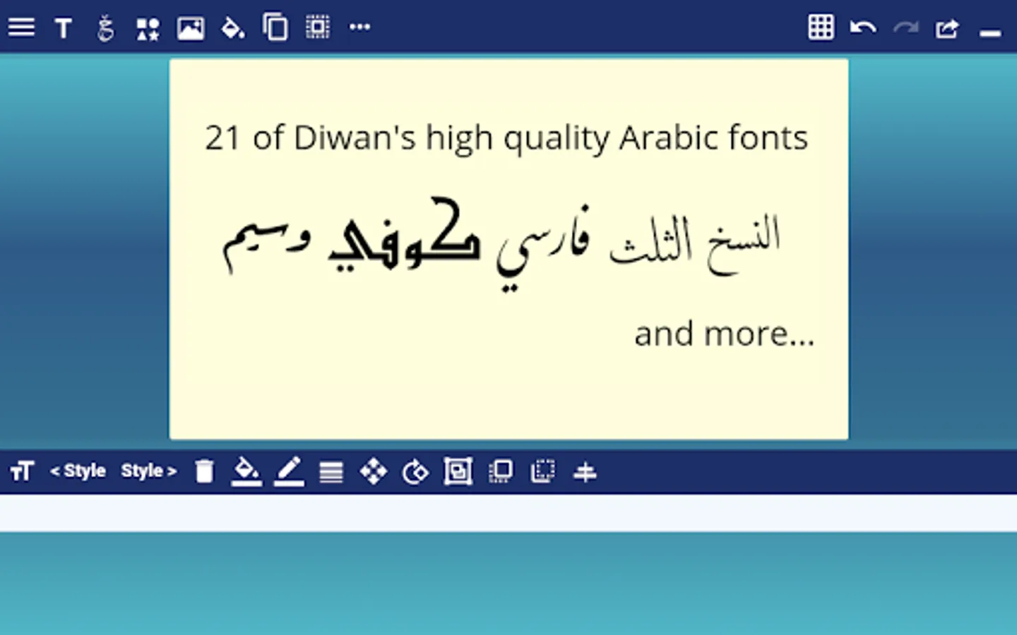 - 21 fonts including Diwan Naskh Mishafi, Diwan Thuluth, Diwan Farsi, Waseem (Ruqa’a like font), Kufi, and more.
