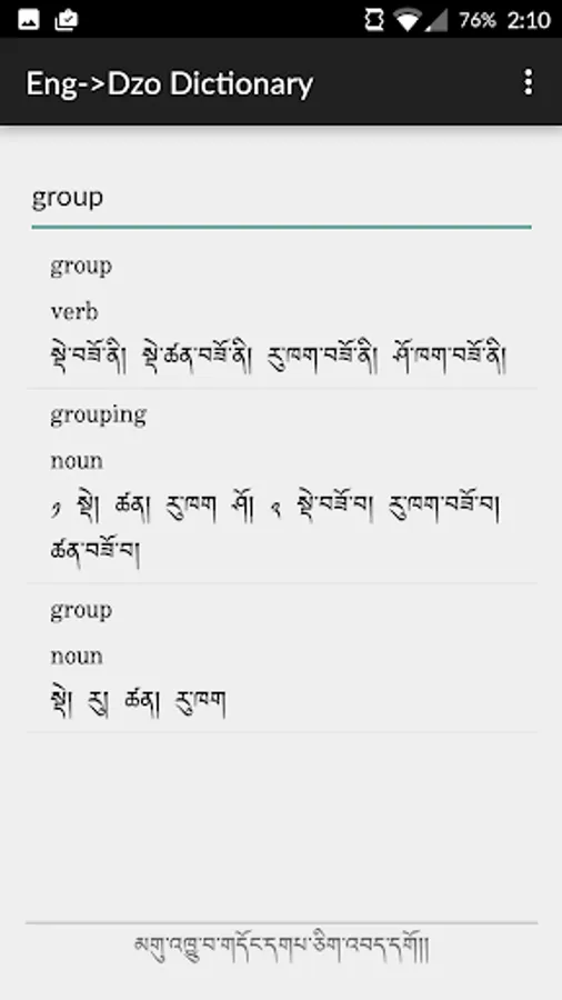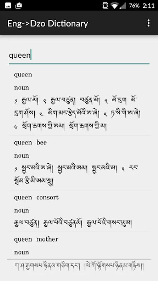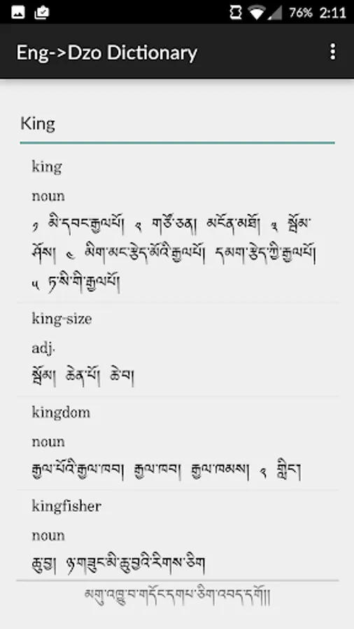 This app is an Offline English to Dzongkha dictionary. Dzongkha is the national language of Bhutan. It has about 160,000 native speakers and about 470,000 second language speakers.