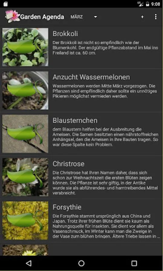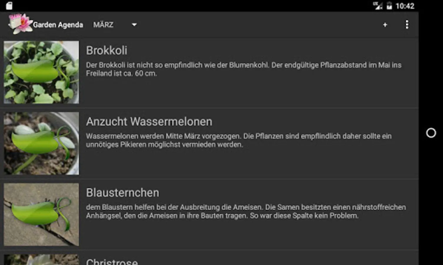 Garden agenda shows upcoming garden work on for each month. Monthly all plants or fruits are listed. You can create new entries with photos or sketches. Publication is also possible.