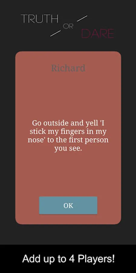 This Truth or Dare Multiplayer App includes several games designed to lift up the atmosphere in your home or at a party where it is possible to add up to 4 players simultaneously.