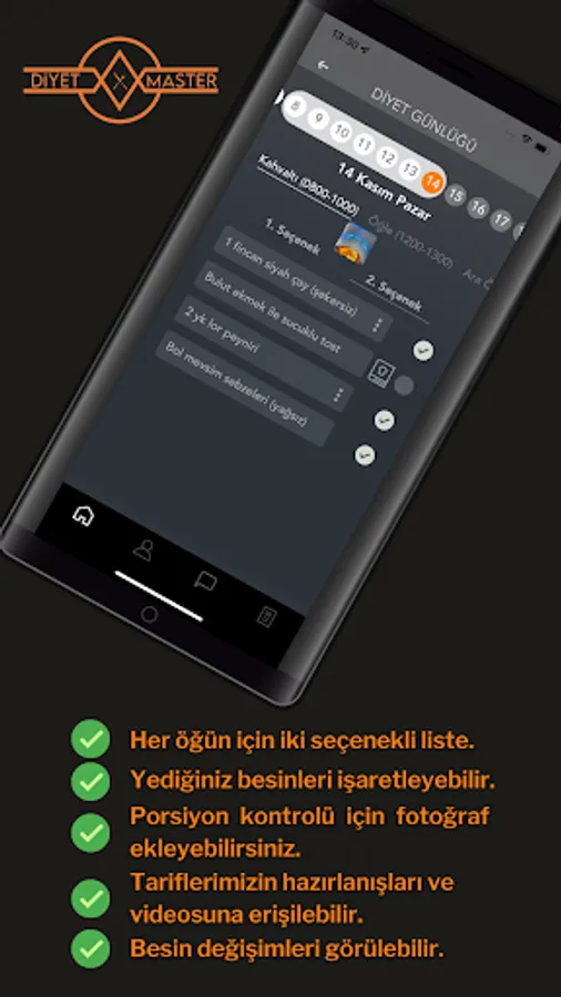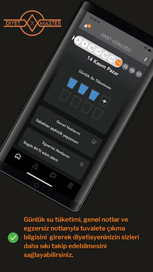 In our application, we make your diet easier with our special meal reminders as well as our water and exercise notifications. A special notification will be sent to you at meal times according to the characteristics of the diet you have purchased. We support our users who have a busy work schedule or who experience forgetfulness with our technology.
