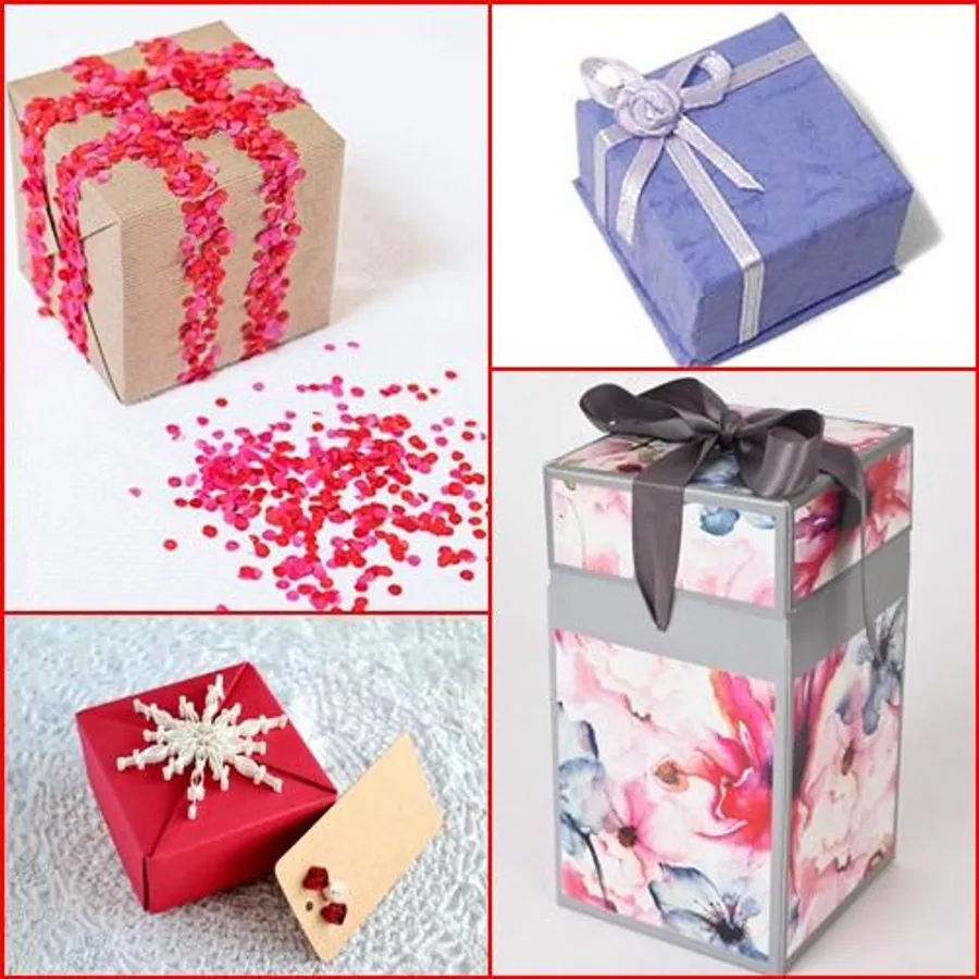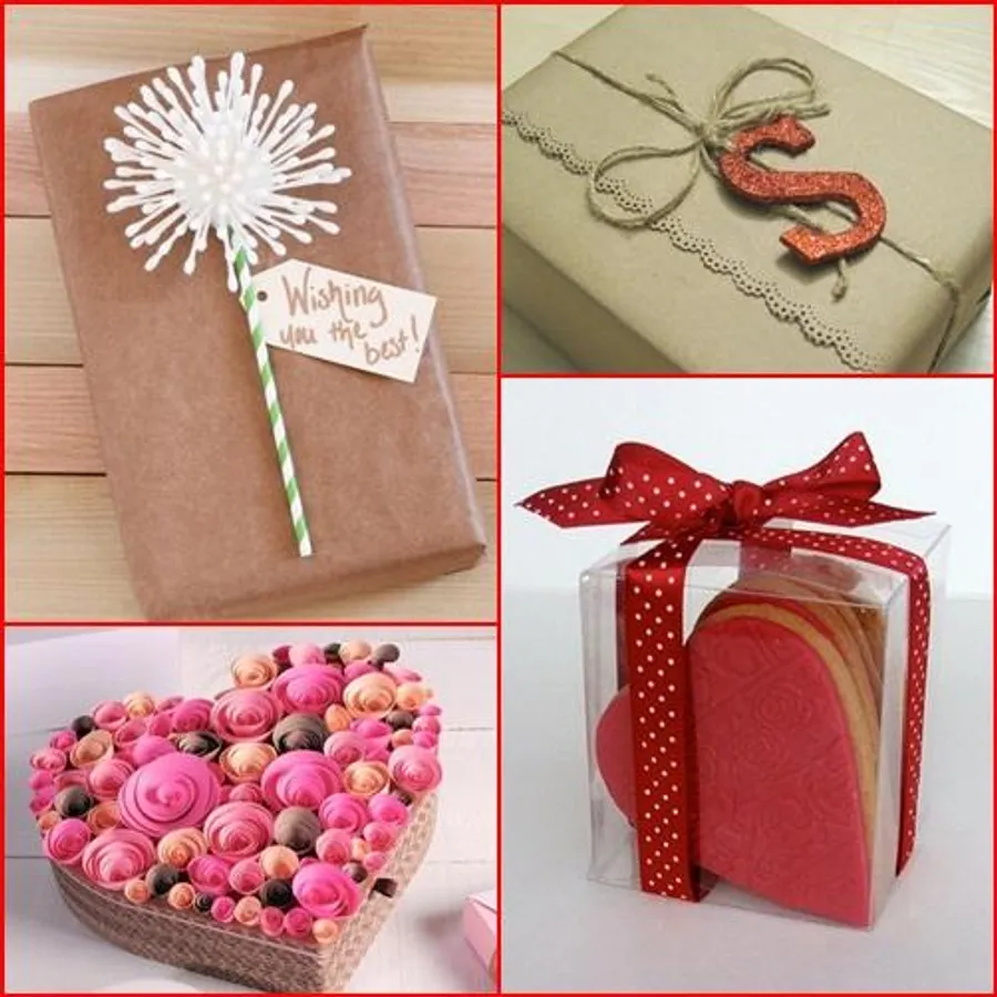 gift wrapping box designs - For small items, buy small Chinese take out cartons, the ones that have a folded top and metal handle. Decorate the outside with brightly colored stickers of hearts, flower. Write the recipients name on the top flaps.