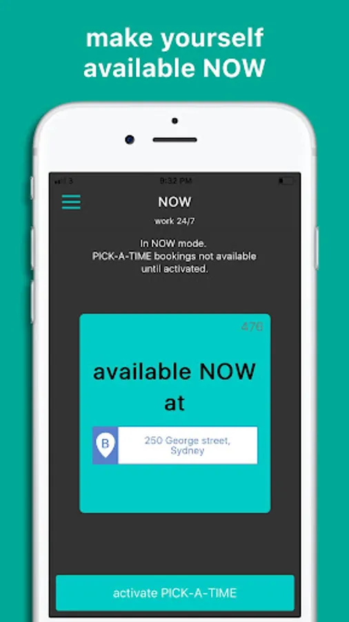 Select if you want to be available NOW or at any time slots the app allows, in one easy step and freely switch between the two any time.