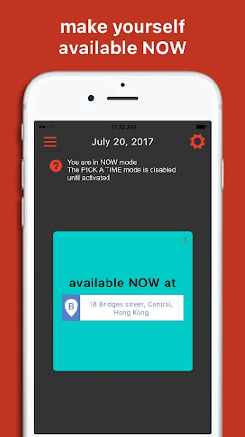 Select if you want to be available NOW or at any time slots the app allows, in one easy step and freely switch between the two any time.